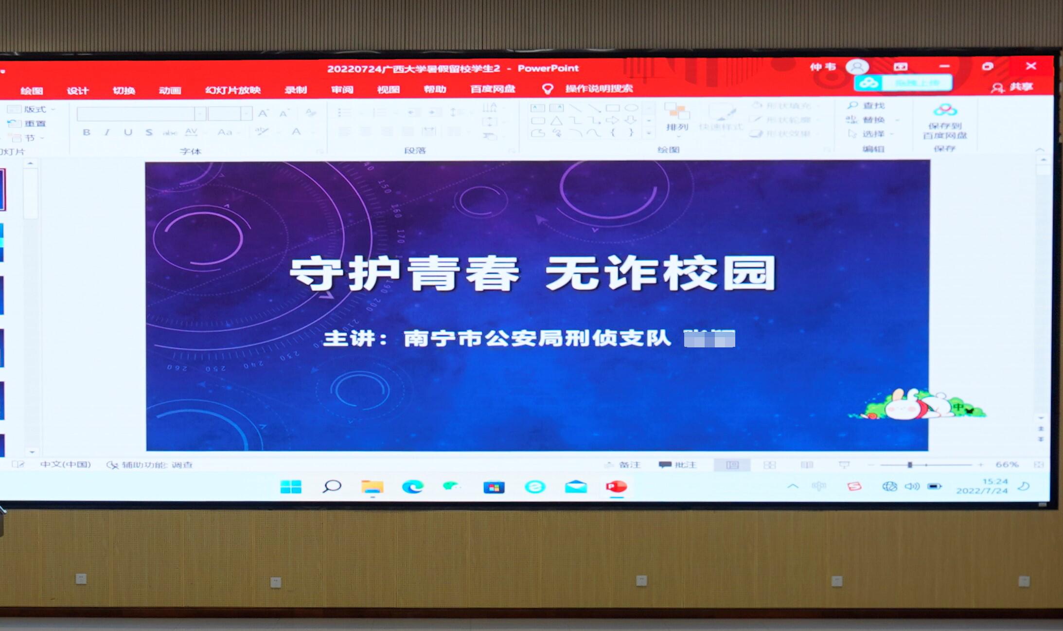 为普及反诈骗知识,降低大学生受诈骗率,2022年7月24日,南宁市公安局刑侦支队在资环材学院123报告厅举办“守护青春 无诈校园”反诈宣传讲座,啪啪啦