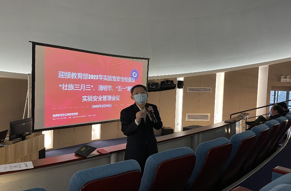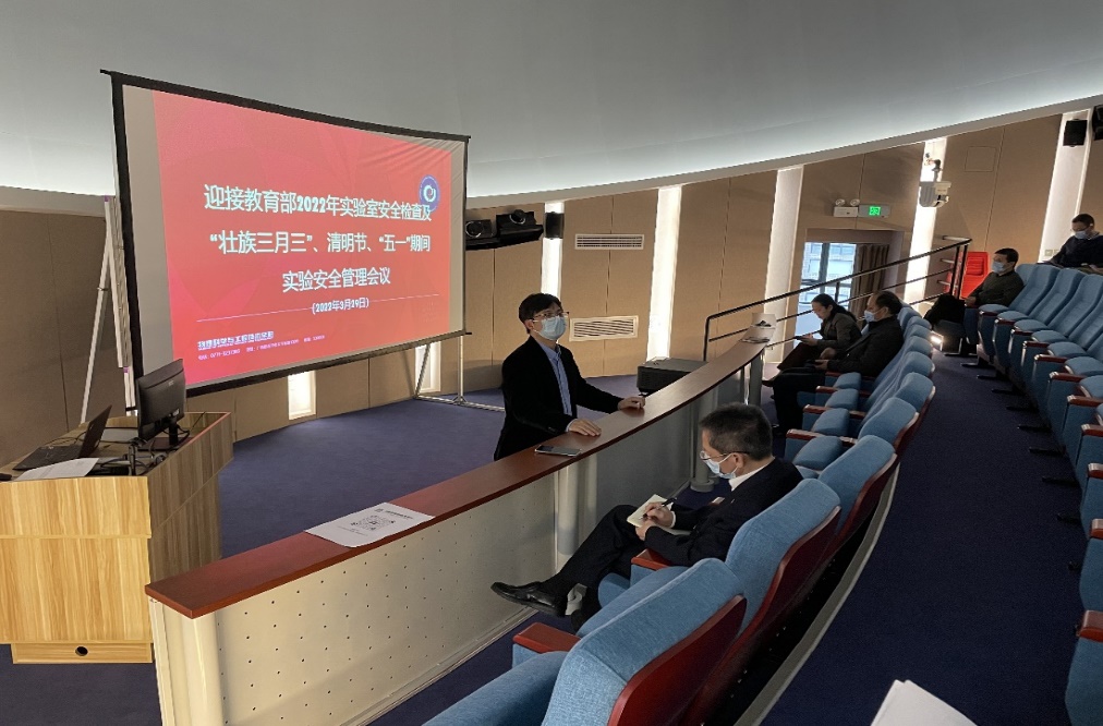在学院天象馆召开实验室负责人及安全责任人会议,对迎接教育部实验室安全检查进行动员,对广西三月三、清明节、五一节假日期间实验安全管理工作进行部署。会上,党委书记袁涛强调要对实验室安全隐患进行“全过程、全要素、全覆盖”排查,以教育部有关文件精神为行动指南,以良好的状态迎接教育部实验室安全检查。常务副院长王祥高布置了近期实验室安全重点工作,指出开展此次实验室安全大检查的重要性和必要性。院长助理、实验中心主任陆翔对教育部2022年高等学校实验室安全检查工作的背景、要求和工作安排进行了说明,并对实验室安全自查自纠做了具体安排,要求各实验室在广西三月三、清明节、“五一”等假期期间落实好假期使用备案和值班巡查制度。