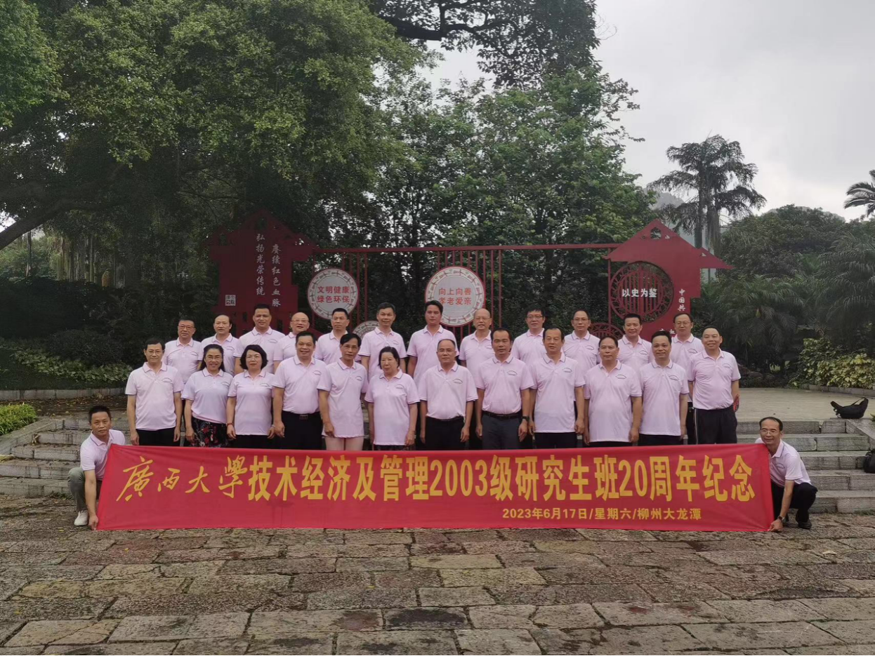 技术经济及管理2003级研究生班(柳州班)20周年纪念活动在柳州大龙潭公园举行,活动围绕“边照相、边交流、边唱歌、边朗诗、边听歌“——即“五边”的主题开展。啪啪啦