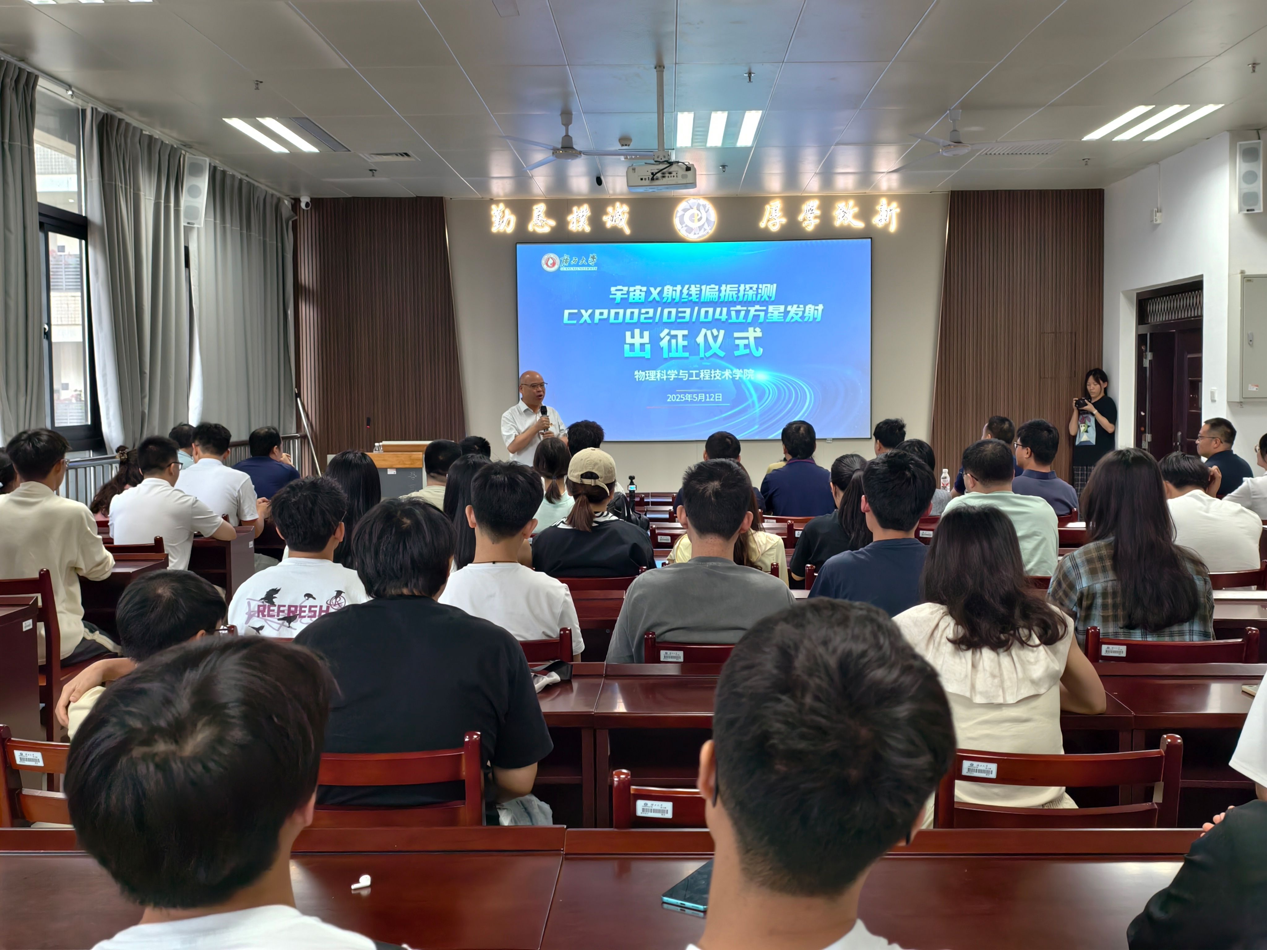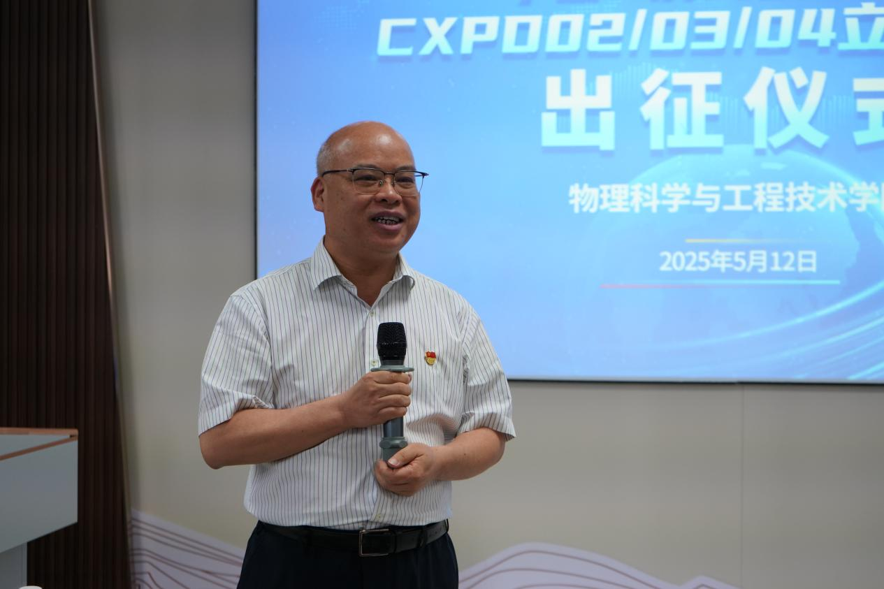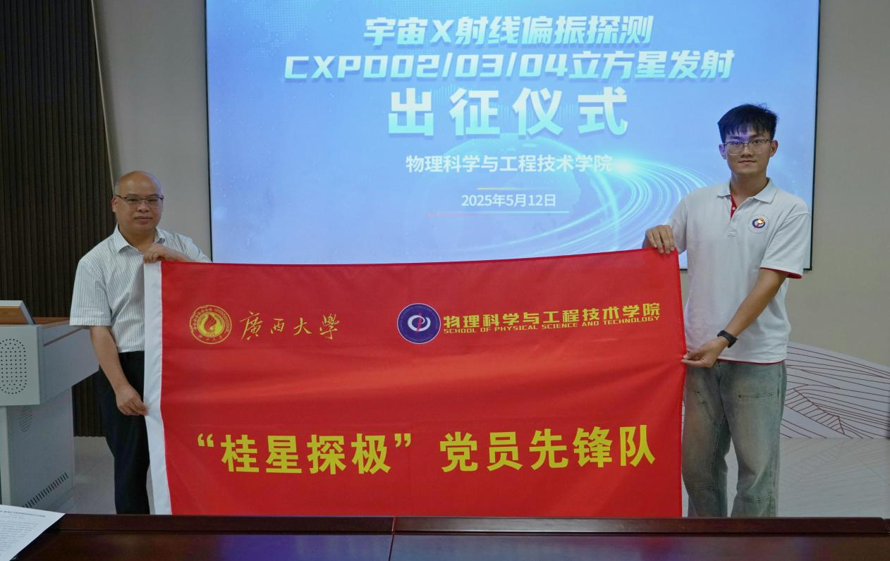 举行宇宙X射线偏振探测(CXPD)系列立方星发射出征仪式,为即将奔赴酒泉卫星发射中心见证发射任务的团队壮行。校党委常委、副校长梁恩维为出征团队授旗并讲话,啪啪啦