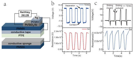 图a 器件结构图,图b接触分离模式下的自驱动阻变性质,图c滑动模式下的自驱动阻变性质