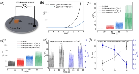 金属半导体直流摩擦电纳米发电机(MSDC-TENG)因其功率密度比传统发电机高102−103倍而受到越来越多的关注。作为第三代半导体材料, GaN具有独特的光电特性。在本论文中,我们首先制备的新型Cu/GaN MSDC-TENG的性能并不令人满意(开路电压(Voc)~5.6 V,短路电流(Isc)密度~0.5 A/m2)。随后我们用Mg2+离子掺杂GaN形成P型GaN,并通过调节P型GaN的载流子浓度来调节发电机的Isc密度。实验结果表明,随着载流子浓度的增加,Cu/GaN摩擦电纳米发电机的Voc从5.6 V增加到14.2 V,Isc密度增加了51倍(Isc密度从0.5 A/m2增加到25.5 A/m2)。我们的实验过程结合宽禁带半导体能带理论为MSDC-TENG的电流密度调节提供了一种崭新的思路。