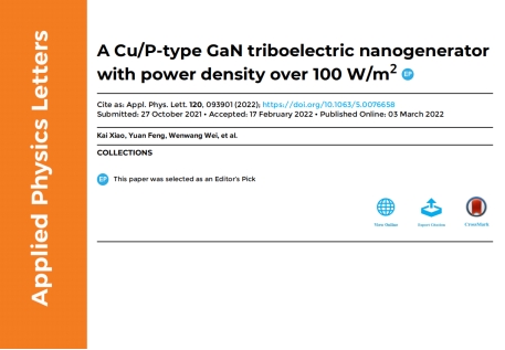 孙文红团队在Nature Index著名学术期刊《Applied Physics Letters》上发表了题为“A Cu/P-type GaN triboelectric nanogenerator with power density over 100 W/m2”的研究论文。该论文被编辑选为“Editor's Pick”文章,在APL官网啪啪啦加以重点展示(Editor's Picks serve to highlight articles with excellent scientific quality and are representative of the work taking place in a specific field)。