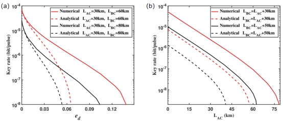 最后,为了证明数值方法的通用性,针对MDI-QKD协议,在数值分析框架中考虑了非对称情况的MDI-QKD,利用数值技术的优势提高了非对称测量设备无关的实际性能。仿真结果显示(如图4所示),与传统方法(Analytical)相比,该工作的方法(Numerical)对系统错误率容忍度提高了2倍。在MDI-QKD信道高度不对称的情况下,密钥率提高了10倍,传输距离提高了20公里。研究成果发表于《Physica Scripta》。