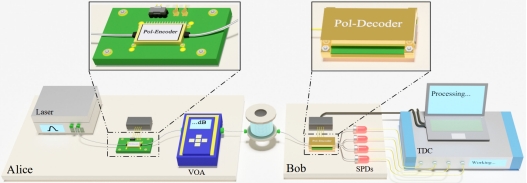 Alice端:Laser:激光器,Pol-Encoder: 偏振编码芯片,VOA:可变光衰减器;Bob端:Pol-Decoder: 偏振解码芯片,SPD:单光子探测器,TDC:时间数字转换器。Alice和Bob通过光纤链路连接。