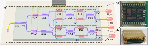量子密钥分发(Quantum Key Distribution,QKD)的安全性基于量子力学的基本定律,已成为信息时代保障信息无条件安全的关键解决方案。随着第一个QKD协议被提出以来,QKD在理论和实验研究上都不断取得了新进展。当前,利用硅基光电集成技术发展一套稳定、简单、低成本和小型化的QKD系统是推动该技术实用化和商业化的关键。其中,偏振编码的方案在基于光纤和自由空间信道的QKD系统中得到了广泛应用。然而,由于利用硅基光电集成技术很难实现偏振转换,导致之前的芯片化系统一般利用光纤光学器件解码偏振态,或利用芯片外的额外器件进行偏振的跟踪和补偿。因此,如何实现偏振解码器的完全集成一直是偏振编码QKD全系统集成的难点。