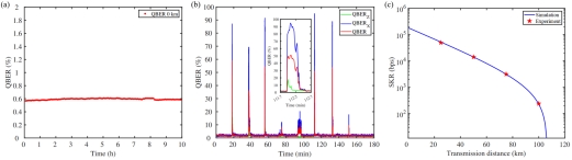 (c) 不同光纤距离下的安全密钥率。红色五角星表示在实际距离下的实验结果,蓝色实线表示基于实验参数的理论模拟结果。