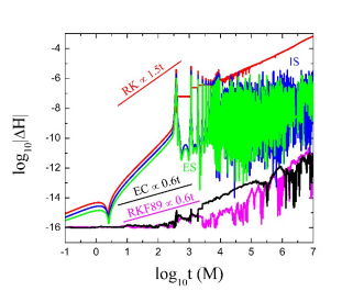 图一 不同算法的能量误差图,EC(黑色)为本文构造的保能量算法。时间t在200个双星总质量内,所建立的算法可使能量保持到机器精度;但随着积分继续,受舍入误差影响,能量误差有缓慢增长趋势。