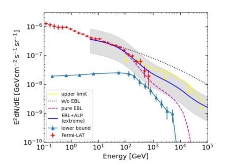 对类轴子粒子的研究可为强CP问题、暗物质等基础物理问题提供线索,是近年暗物质方面的研究热点。在LHAASO时代大家比较关注的一个内容是这类粒子的存在对宇宙TeV光子的传播光深带来的影响。之前的研究大多侧重于对单个天体源进行分析,即使选取一批源也是对其中每一个分别、独立地分析。这会带来许多模型不确定方面的问题。为此我们尝试去计算了类轴子的存在对大量活动星系核的累积辐射(即河外弥漫伽马射线背景)的影响。我们发现ALP的存在确实会影响弥漫伽马射线背景的能谱,但与纯天体物理模型的偏离发生在1TeV以上。当前的EGB观测无法对两种模型进行鉴别,未来的更高能段的EGB观测或会对发现这样的效应有帮助。