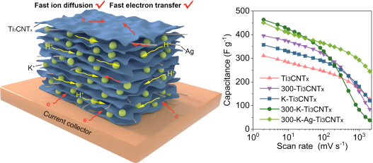新能源团队通过对Ti3CNTx基电极材料进行钾离子插层及表面改性,并进一步在Ti3CNTx层间引入银纳米线,得到了兼具高比电容和高倍率性能的300-K-Ag-Ti3CNTx电极材料。300-K-Ag-Ti3CNTx电化学性能的提高可归因于Ti3CNTx层间距的增加和表面官能团浓度的降低以及高导电性。实验结果表明,在纳米片之间插入阳离子并降低官能团浓度可以显著提高Ti3CNTx的质量比电容,在引入K+并去除官能团(-OH,-F)后,质量比电容大幅提高到464 F g-1。Ti3CNTx 基薄膜的电导率受层间阳离子和表面官能团的影响。300-K-Ag-Ti3CNTx薄膜的电导率增加到1030.93 S cm-1,并显示出优异的倍率性能,即使在2000 mV s-1下,其质量比电容也可以保持在245 F g-1。表现出优异的倍率性能。基于300-K-Ag-Ti3CNTx薄膜的全固态对称超级电容器在350 m W g-1时显示出6.9 mWh g-1的高能量密度,表明它们在柔性储能装置方面有很大的应用潜力。这项工作将进一步推动柔性MXenes基电极的研究;特别是Ti3CNTx基电极,在超级电容器和可穿戴电子设备领域具有广阔的应用前景。