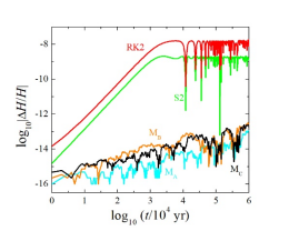 图一 左:不同算法的能量误差图,MC为本文构造的6维保能量算法,该算法可以在100亿年内将体系能量误差控制在10-13以下,为得到精确的数值解提供保障;
