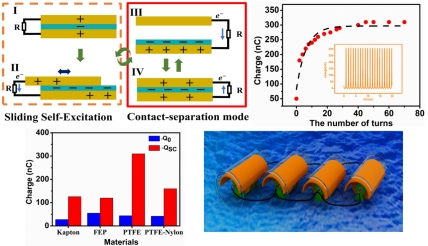摩擦纳米发电机是收集低频水波能的一种具有发展前景的能源技术,而产生高的表面电荷密度是实现摩擦纳米发电机高输出的关键因素之一。然而,在实际工作中,产生高表面电荷密度并长时间维持是一个难题。传统的接触分离模式由于摩擦不充分难以达到高表面电荷密度,而滑动摩擦模式虽可大幅提升表面电荷密度但摩擦损耗会降低使用寿命。针对以上问题,啪啪啦