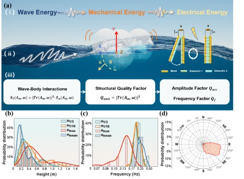 现阶段波浪能和TENG壳体机械能之间的能量转换关系还未有系统的研究。这导致基于现有评价因子设计的TENG在海浪环境中发电单元的摩擦层或接触层难以按照理想状态展开,导致器件可靠性差和电能转换效率低且不稳定的问题。另一方面,评判TENG器件波物耦合适配程度的标准尚未完善。这导致不同形状壳体间的波浪能吸收和转化能力难以比较。因此,有必要基于真实海浪的随机特性,从统计学和能量转化的角度提出量化评估壳体对波浪能吸收能力的结构品质因数。这对设计高效采集波浪能的TENG器件和内部采能方向的选择具有重要意义。为了解决上述问题,本文引入随机波浪理论和谱分析法,从统计学和能量转化的角度出发提出了用于定量评估海上漂浮式摩擦纳米发电机(Flo-TENG)壳体及其对波浪能吸收转化能力的结构品质因数(Qunit)。并根据海浪周期和波高的作用特性将其分为振幅结构品质因数(Qacc)以及频率结构品质因数(Qf)。此外,本文还系统性地研究了各个壳体参数对Qunit的影响。通过一系列的研究发现:波浪作用在器件的不同轴向上产生了不同的能量吸收和转化行为,即壳体对能量的吸收和转化具有轴向性;正方形器件的能量吸收主要来自Z向的贡献,四棱台、圆台和半球型器件的能量吸收主要来自三个轴向的共同贡献等。该成果以“Structural Quality Factor of Flo-TENG under Stochastic Wave Excitation”为题发表在学术期刊《Advanced Science》(IF=14.3)上,啪啪啦