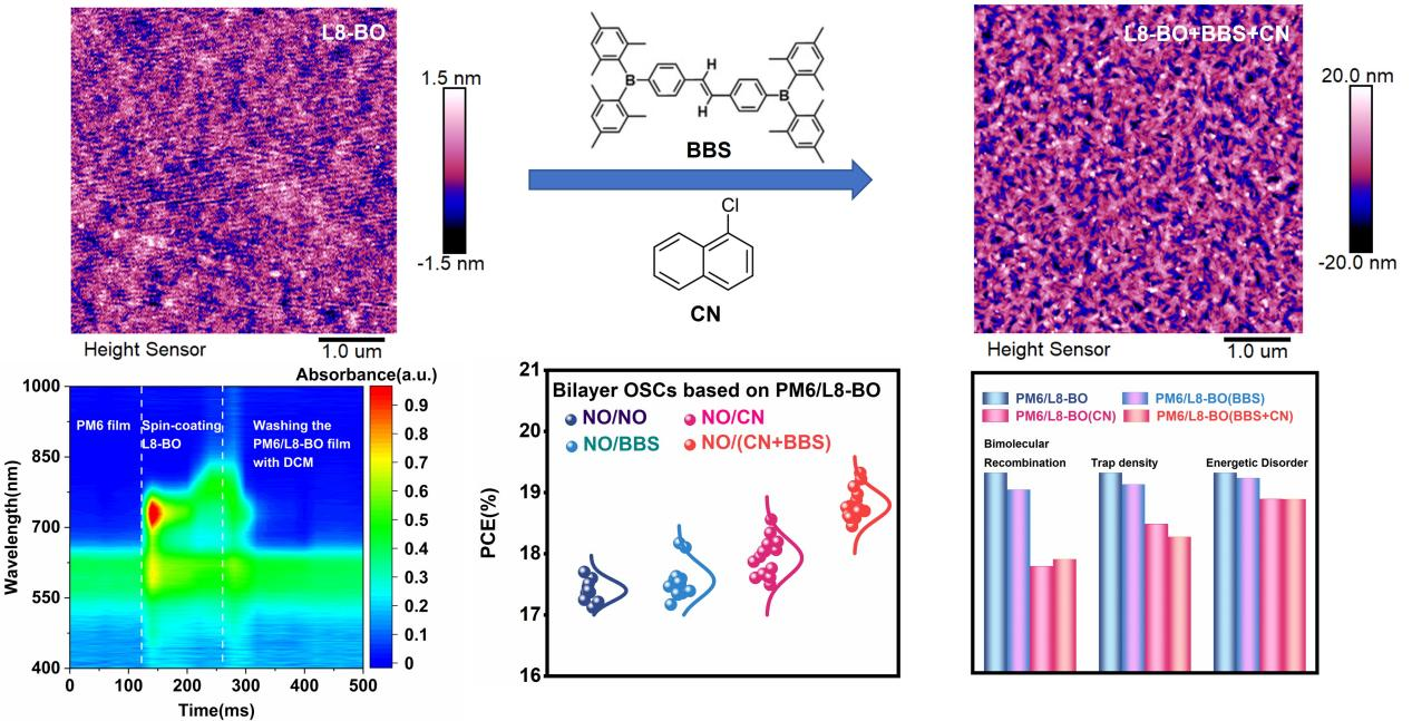 薄膜光伏研究团队使用“固-液混合添加剂”策略,有效调节双层结构中非富勒烯受体(NFAs)分子的堆积,从而改善NFAs分子的排列有序性。我们观察到,当L8-BO薄膜使用溶剂添加剂1-氯萘(CN)处理时,通过J-聚集增加了结晶度,从而实现了分子的边缘取向和纤维状网络结构。在将固体添加剂反式-双(二甲基苯基硼)苯乙烯(BBS)进一步加入L8-BO溶液后,其中BBS是一种具有多发射位点的荧光有机硼衍生物,它有助于L8-BO分子的紧密有序堆积,改善了薄膜的有序性,并形成了絮状结构。随后,与PM6配对通过顺序旋涂法制备了双层OSCs,以研究器件性能与形貌诱导的分子有序性之间的关系。结果显示,参考器件的PCE仅为17.70%,而加入CN后,性能提升至18.56%,这主要归因于填充因子(FF)的显著变化。进一步加入BBS,FF和短路电流密度(JSC)进一步增加,实现了19.32%的PCE,这是双层器件中最高的值之一。我们将器件性能的提升归因于减少的缺陷复合,从而提高了电荷提取和分离效率。而且,形貌的变化也引起了优异的性能稳定性,当1500h的储存时间后,仍然维持了初始效率的91%。这项研究的结果揭示了双添加剂对NFAs形貌的调制作用,对于实现高效的双层有机光伏电池影响深远。