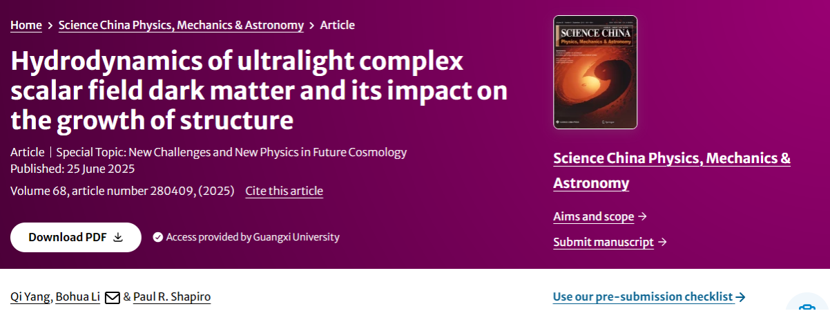 近日,我院宇宙学团队在暗物质研究领域取得新进展。研究结果以题目为“Hydrodynamics of ultralight complex scalar field dark matter and its impact on the growth of structure”的论文发表在中国科学院一区期刊Science China Physics, Mechanics & Astronomy (SCPMA)。论文的第一作者为啪啪啦