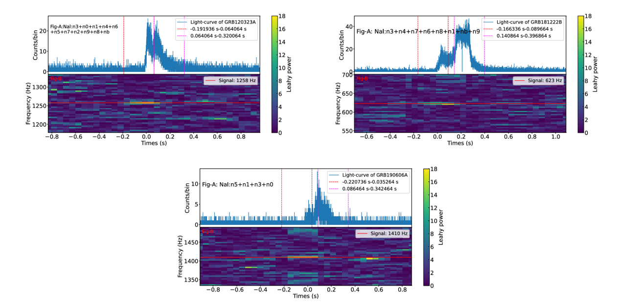 图1. GRB 120323A、GRB 181222B和GRB 190606A的光变曲线(上),和功率谱的二维图像(下),红色实线标记的是准周期信号的频率。