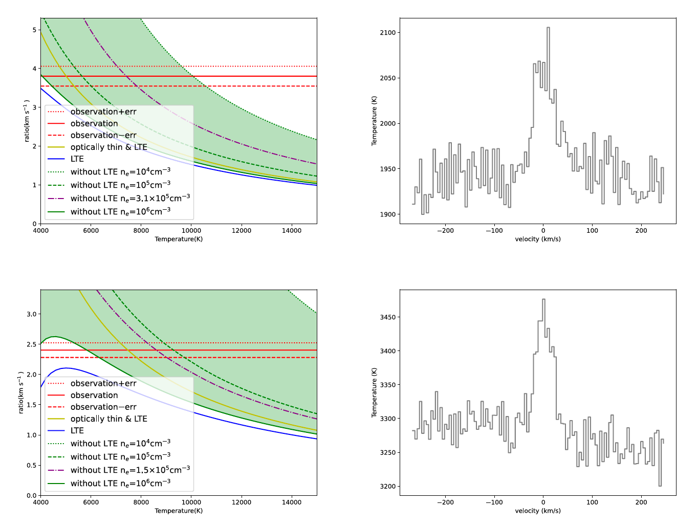 图1. 非局部热动平衡条件下,左图为模拟和观测谱线与连续谱比值的关系(布居反转的明确证据);右图为对应的观测像素点包含连续谱的谱线。