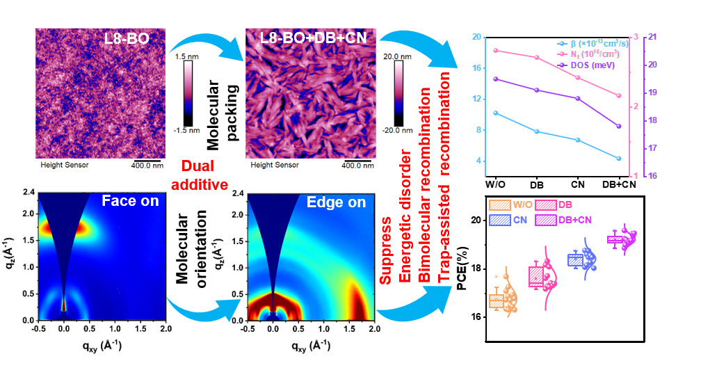 有机太阳能电池的性能受活性层内受体分子堆积特性的显著影响,而受体分子的堆积特性对优化电荷动力学过程与光伏性能至关重要。然而,要实现对这种堆积结构的精准调控,仍面临巨大挑战。文章提出一种双添加剂策略,通过联用二苯并呋喃(dibenzofuran)与卤代萘(halogenated naphthalene),系统性调控受体分子的堆积取向,并提升其长程分子堆积有序性。其中,二苯并呋喃的关键作用是促进材料结晶,助力有序结构形成;卤代萘则负责调控分子取向,确保分子排列规整。具体而言,二苯并呋喃与1-氯萘(1-chloronaphthalene)联用后,可促进受体分子形成“边对边”(edge-on)堆积模式,并推动有序性更高的纳米纤维结构生成,这一变化最终实现了电荷传输性能与器件整体性能的提升。将该策略应用于PM6/L8-BO体系器件中,其光电转换效率(PCE)达到19.58%,且器件具备优异的长期稳定性。此外,1-氟萘(1-fluoronaphthalene)在改善分子取向与提升器件效率方面同样表现出良好效果,充分证明了该双添加剂策略的普适性。本研究通过解决活性层内分子堆积与取向调控的关键难题,为有机太阳能电池的实用化优化提供了极具价值的参考。