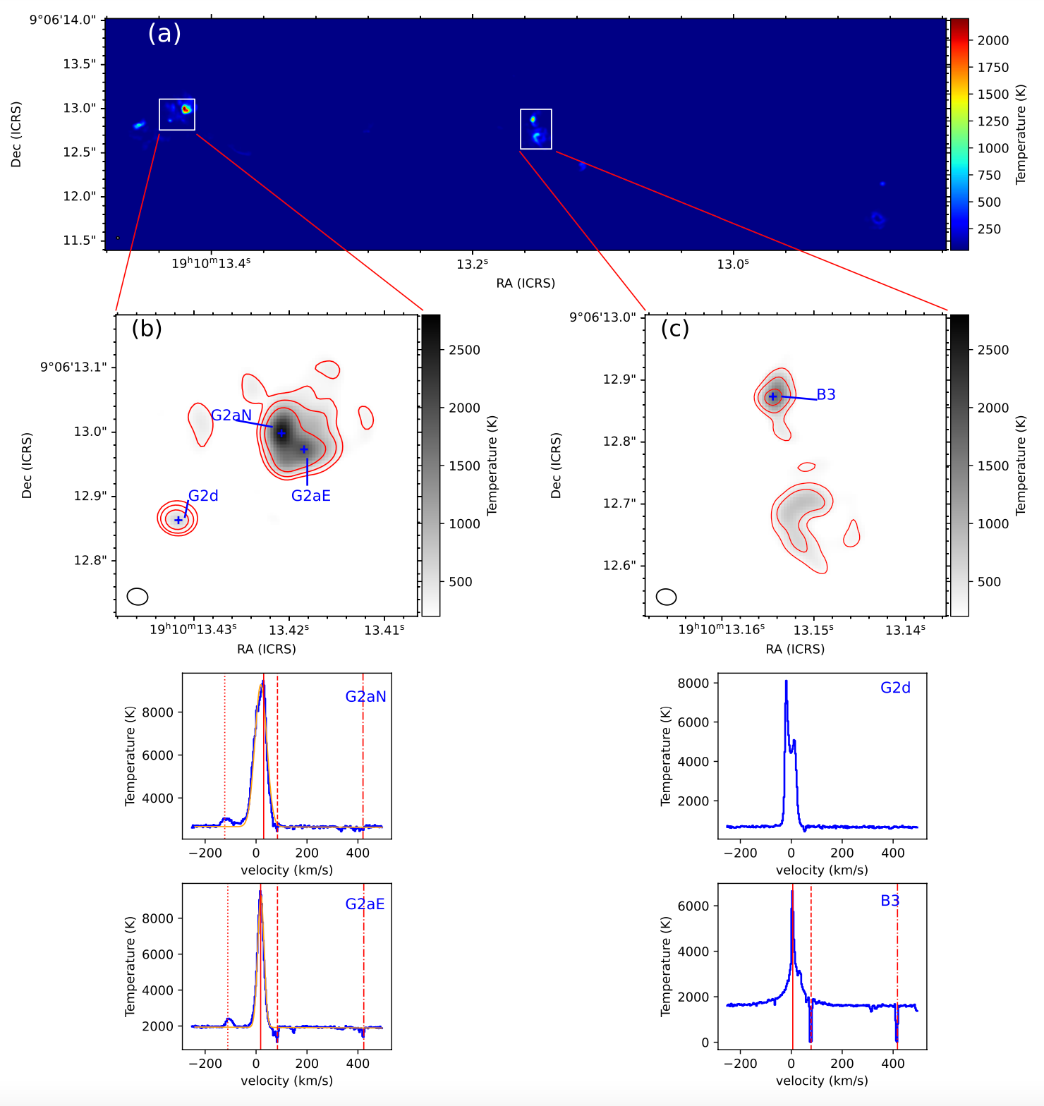 博士研究生路哲与合作者利用高灵敏度、高分辨率的ALMA存档数据,在W49A区域开展了角分辨率达0.03角秒的H29��射电复合线谱线观测,新发现了4个强H29��射电复合线脉泽发射源。此前,天体中发现强射电复合线脉泽源的个数仅为个位数,此项发现使其增至10余个,显著扩充了该稀缺样本。